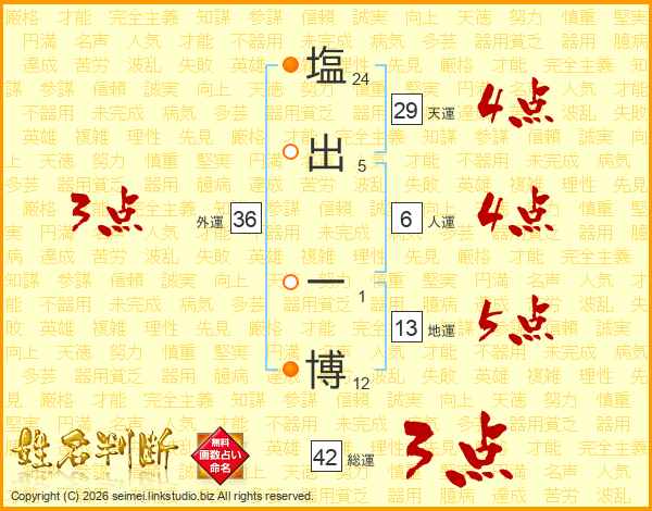 生活面を象徴する運勢です。外部から受ける影響力を表し、結婚運、家庭運や職場、環境への順応性を表します。総運から人運を引いた画数。姓や名が1文字の場合を除く。