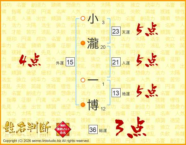 生活面を象徴する運勢です。外部から受ける影響力を表し、結婚運、家庭運や職場、環境への順応性を表します。総運から人運を引いた画数。姓や名が1文字の場合を除く。