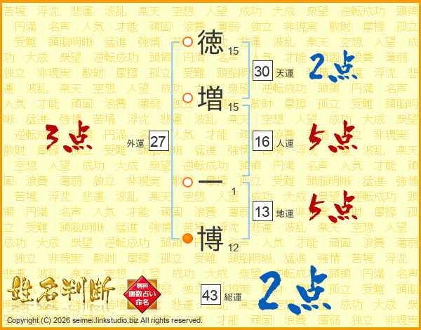 徳(15画)増(15画) 一(1画)博(12画)
