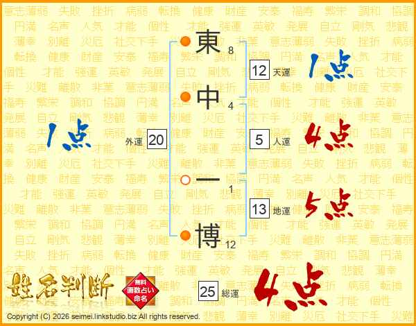 生活面を象徴する運勢です。外部から受ける影響力を表し、結婚運、家庭運や職場、環境への順応性を表します。総運から人運を引いた画数。姓や名が1文字の場合を除く。