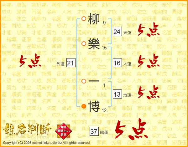 柳(9画)樂(15画) 一(1画)博(12画)