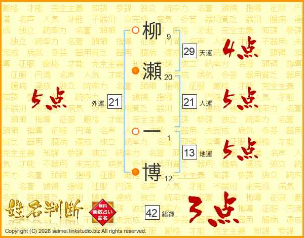 柳(9画)瀬(20画) 一(1画)博(12画)