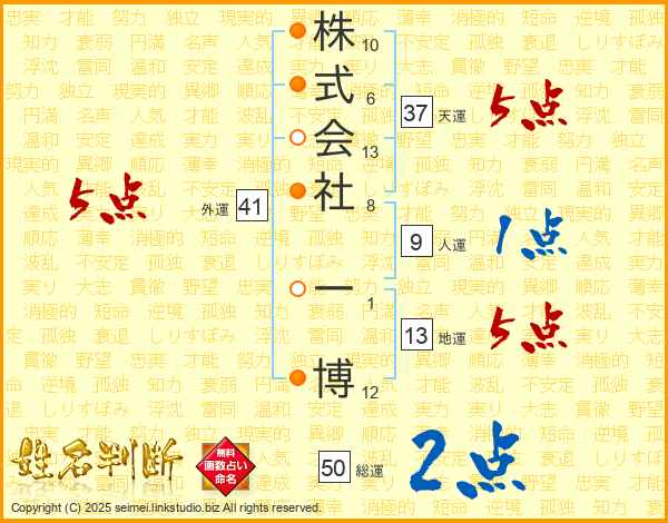 生活面を象徴する運勢です。外部から受ける影響力を表し、結婚運、家庭運や職場、環境への順応性を表します。総運から人運を引いた画数。姓や名が1文字の場合を除く。