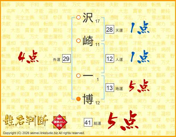 生活面を象徴する運勢です。外部から受ける影響力を表し、結婚運、家庭運や職場、環境への順応性を表します。総運から人運を引いた画数。姓や名が1文字の場合を除く。