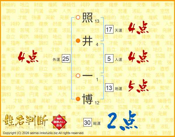 生活面を象徴する運勢です。外部から受ける影響力を表し、結婚運、家庭運や職場、環境への順応性を表します。総運から人運を引いた画数。姓や名が1文字の場合を除く。