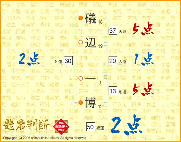 生活面を象徴する運勢です。外部から受ける影響力を表し、結婚運、家庭運や職場、環境への順応性を表します。総運から人運を引いた画数。姓や名が1文字の場合を除く。