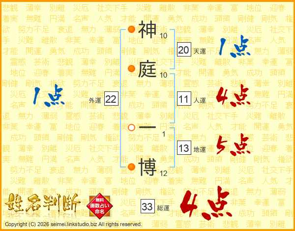 生活面を象徴する運勢です。外部から受ける影響力を表し、結婚運、家庭運や職場、環境への順応性を表します。総運から人運を引いた画数。姓や名が1文字の場合を除く。