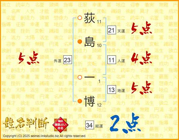 あなたの人生を表す1番重要な運勢です。生涯を通じて影響する総合運となり、主に50歳以降の晩年期に影響を及ぼします。苗字と名前の合計画数。