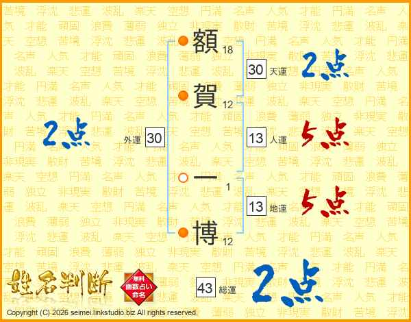 あなたの人生を表す1番重要な運勢です。生涯を通じて影響する総合運となり、主に50歳以降の晩年期に影響を及ぼします。苗字と名前の合計画数。