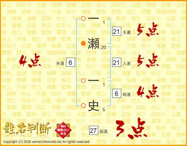 一瀬一史さんの人運は21画の5点!