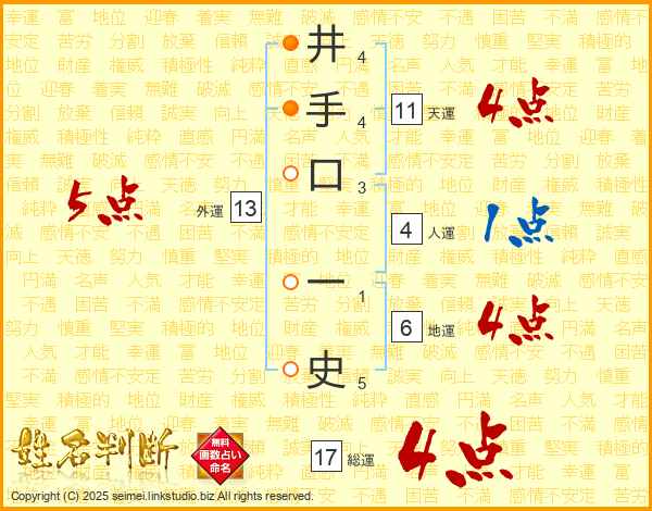 井(4画)手(4画)口(3画) 一(1画)史(5画)