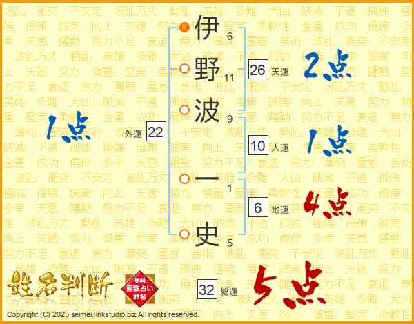 伊(6画)野(11画)波(9画) 一(1画)史(5画)