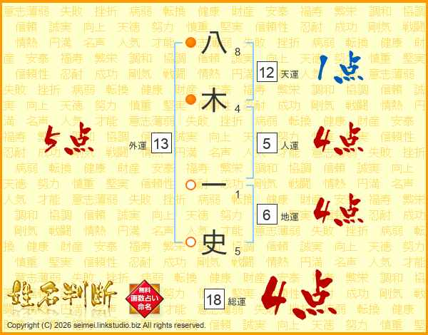 あなたの人生を表す1番重要な運勢です。生涯を通じて影響する総合運となり、主に50歳以降の晩年期に影響を及ぼします。苗字と名前の合計画数。