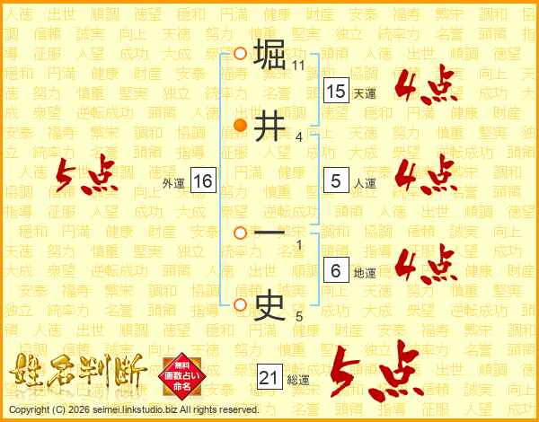 生活面を象徴する運勢です。外部から受ける影響力を表し、結婚運、家庭運や職場、環境への順応性を表します。総運から人運を引いた画数。姓や名が1文字の場合を除く。
