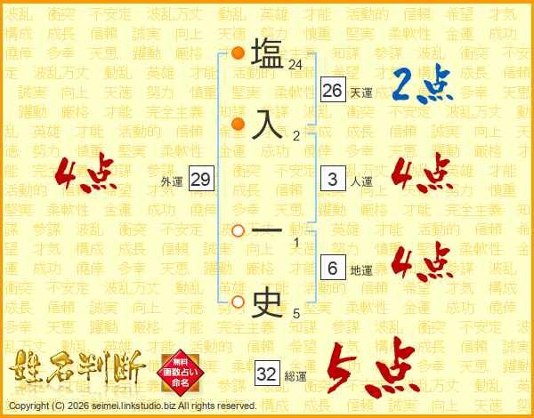 生活面を象徴する運勢です。外部から受ける影響力を表し、結婚運、家庭運や職場、環境への順応性を表します。総運から人運を引いた画数。姓や名が1文字の場合を除く。