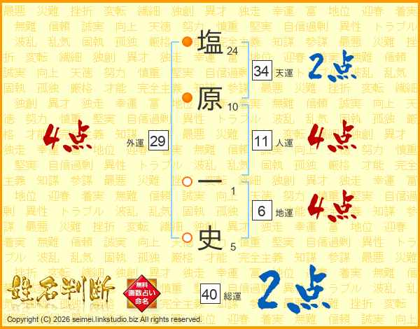 あなたの人生を表す1番重要な運勢です。生涯を通じて影響する総合運となり、主に50歳以降の晩年期に影響を及ぼします。苗字と名前の合計画数。