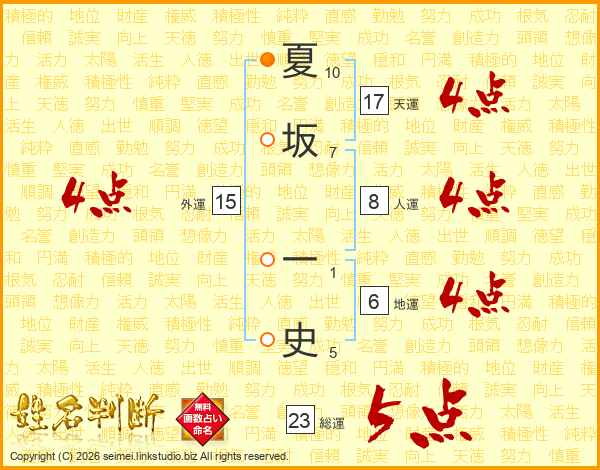 生活面を象徴する運勢です。外部から受ける影響力を表し、結婚運、家庭運や職場、環境への順応性を表します。総運から人運を引いた画数。姓や名が1文字の場合を除く。