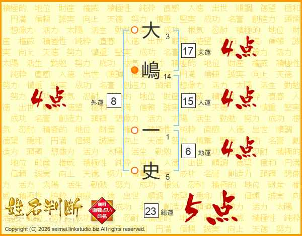 大(3画)嶋(14画) 一(1画)史(5画)