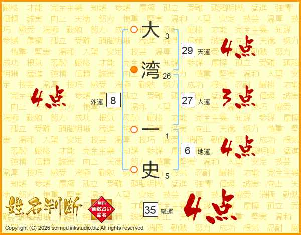 生活面を象徴する運勢です。外部から受ける影響力を表し、結婚運、家庭運や職場、環境への順応性を表します。総運から人運を引いた画数。姓や名が1文字の場合を除く。
