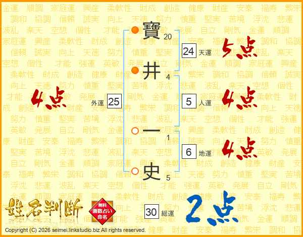 生活面を象徴する運勢です。外部から受ける影響力を表し、結婚運、家庭運や職場、環境への順応性を表します。総運から人運を引いた画数。姓や名が1文字の場合を除く。
