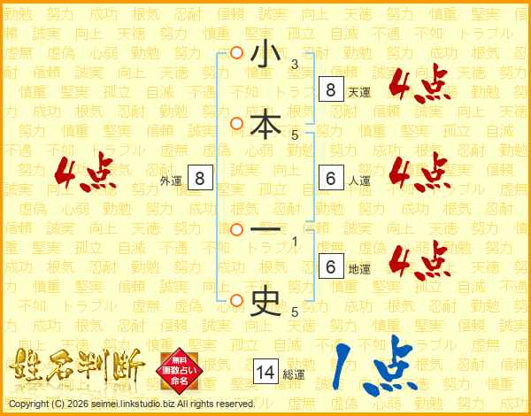 生活面を象徴する運勢です。外部から受ける影響力を表し、結婚運、家庭運や職場、環境への順応性を表します。総運から人運を引いた画数。姓や名が1文字の場合を除く。