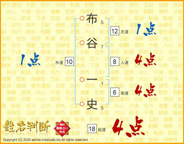 あなたの人生を表す1番重要な運勢です。生涯を通じて影響する総合運となり、主に50歳以降の晩年期に影響を及ぼします。苗字と名前の合計画数。
