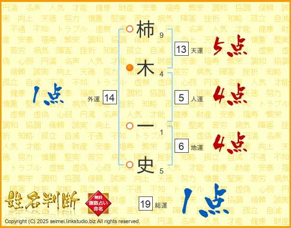生活面を象徴する運勢です。外部から受ける影響力を表し、結婚運、家庭運や職場、環境への順応性を表します。総運から人運を引いた画数。姓や名が1文字の場合を除く。