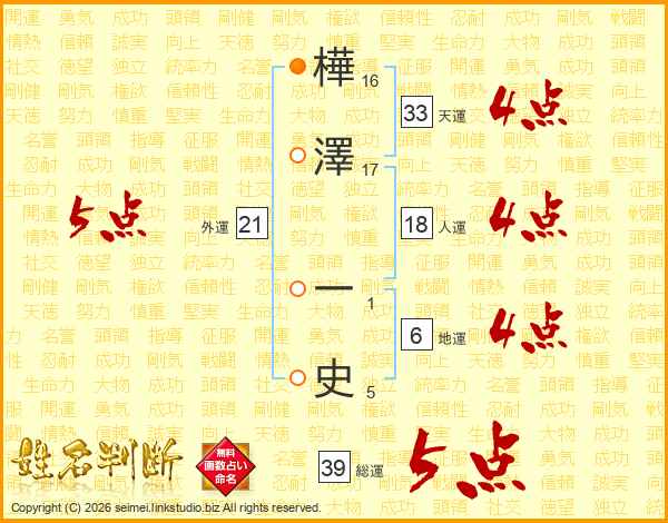 樺(16画)澤(17画) 一(1画)史(5画)