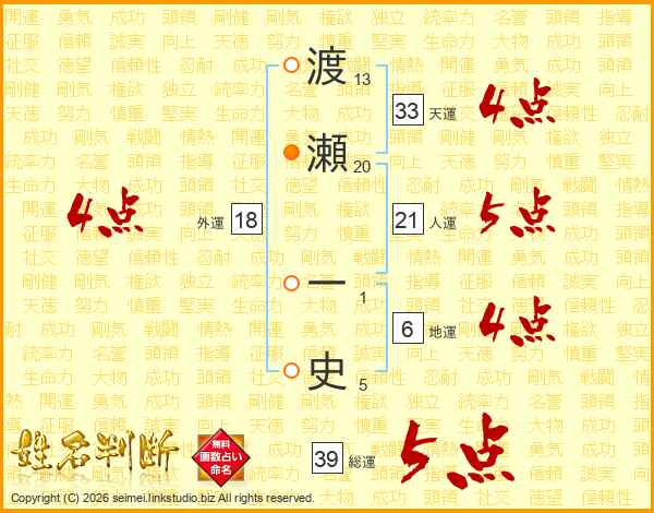 渡瀬一史さんの総運は39画の5点!