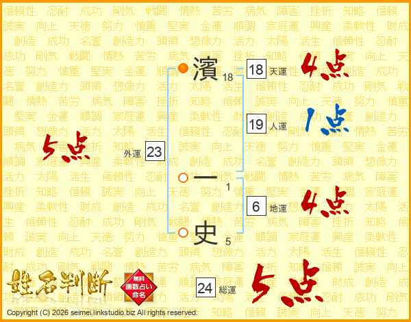 家系が持つ宿命的な運勢を表します。祖先から受け継いだ苗字ですので自分の力が及びません。家柄を象徴します。苗字の合計画数。