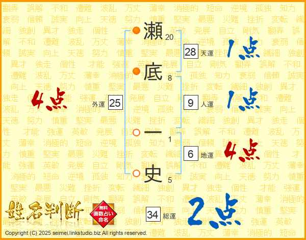 生活面を象徴する運勢です。外部から受ける影響力を表し、結婚運、家庭運や職場、環境への順応性を表します。総運から人運を引いた画数。姓や名が1文字の場合を除く。