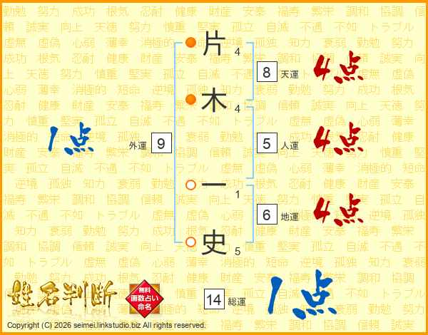 生活面を象徴する運勢です。外部から受ける影響力を表し、結婚運、家庭運や職場、環境への順応性を表します。総運から人運を引いた画数。姓や名が1文字の場合を除く。