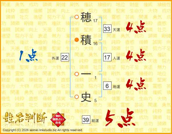 穂(17画)積(16画) 一(1画)史(5画)