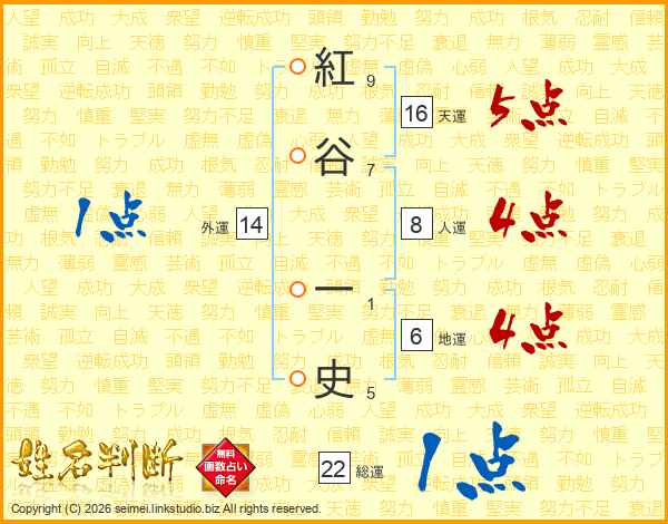 あなたの人生を表す1番重要な運勢です。生涯を通じて影響する総合運となり、主に50歳以降の晩年期に影響を及ぼします。苗字と名前の合計画数。