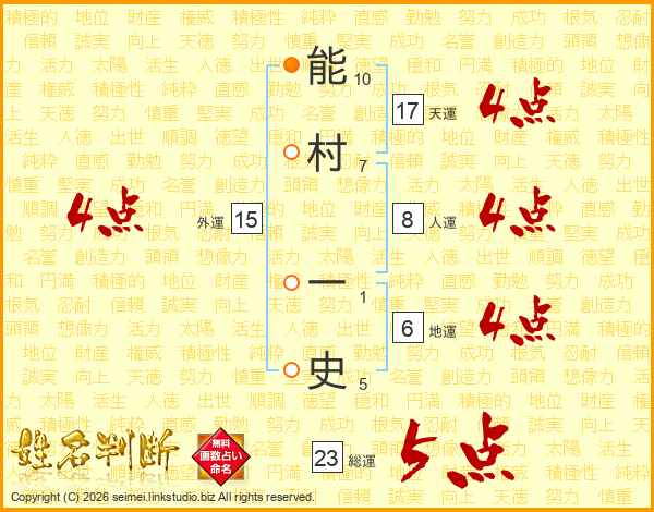 家系が持つ宿命的な運勢を表します。祖先から受け継いだ苗字ですので自分の力が及びません。家柄を象徴します。苗字の合計画数。