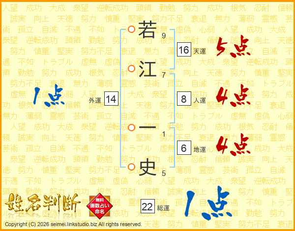 生活面を象徴する運勢です。外部から受ける影響力を表し、結婚運、家庭運や職場、環境への順応性を表します。総運から人運を引いた画数。姓や名が1文字の場合を除く。