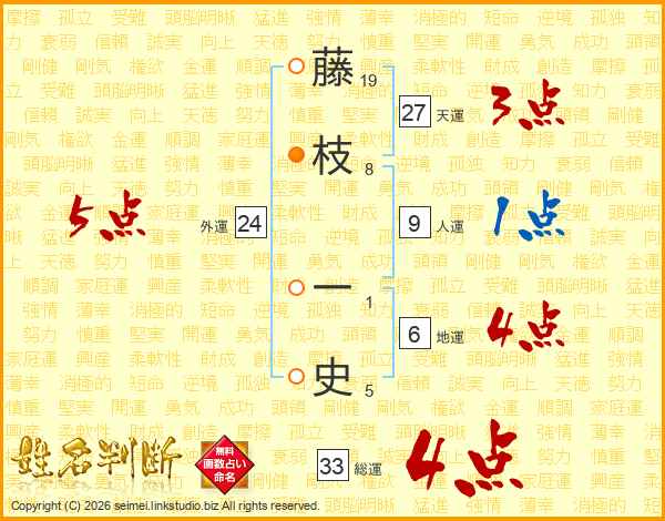 藤(19画)枝(8画) 一(1画)史(5画)