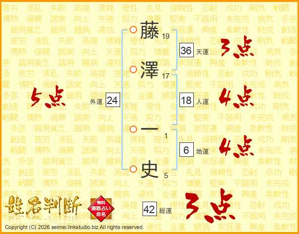 藤(19画)澤(17画) 一(1画)史(5画)
