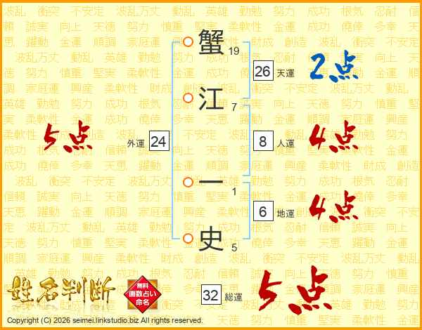 生活面を象徴する運勢です。外部から受ける影響力を表し、結婚運、家庭運や職場、環境への順応性を表します。総運から人運を引いた画数。姓や名が1文字の場合を除く。
