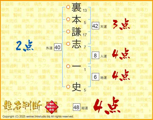 裏(13画)本(5画)謙(17画)志(7画) 一(1画)史(5画)