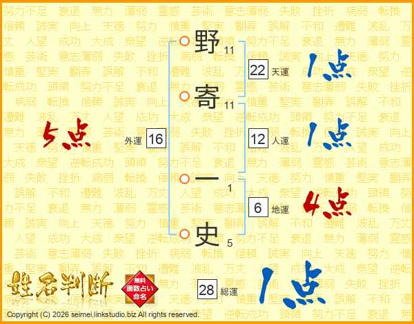 生活面を象徴する運勢です。外部から受ける影響力を表し、結婚運、家庭運や職場、環境への順応性を表します。総運から人運を引いた画数。姓や名が1文字の場合を除く。