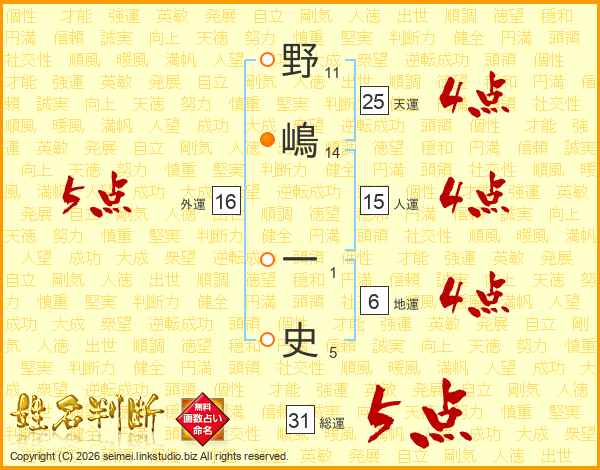 あなたの人生を表す1番重要な運勢です。生涯を通じて影響する総合運となり、主に50歳以降の晩年期に影響を及ぼします。苗字と名前の合計画数。