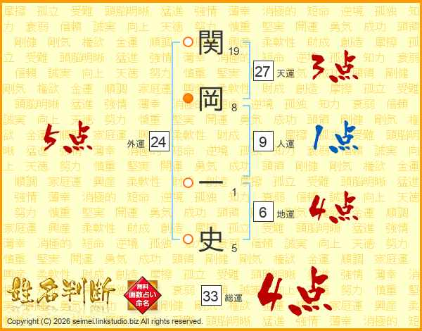 生活面を象徴する運勢です。外部から受ける影響力を表し、結婚運、家庭運や職場、環境への順応性を表します。総運から人運を引いた画数。姓や名が1文字の場合を除く。