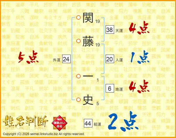 生活面を象徴する運勢です。外部から受ける影響力を表し、結婚運、家庭運や職場、環境への順応性を表します。総運から人運を引いた画数。姓や名が1文字の場合を除く。