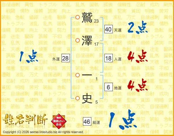 鷲(23画)澤(17画) 一(1画)史(5画)