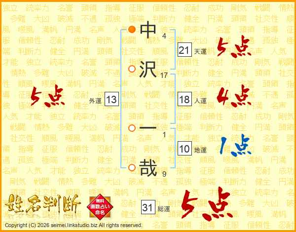 中沢一哉さんの総運は31画の5点!