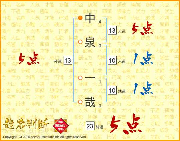 あなたの人生を表す1番重要な運勢です。生涯を通じて影響する総合運となり、主に50歳以降の晩年期に影響を及ぼします。苗字と名前の合計画数。