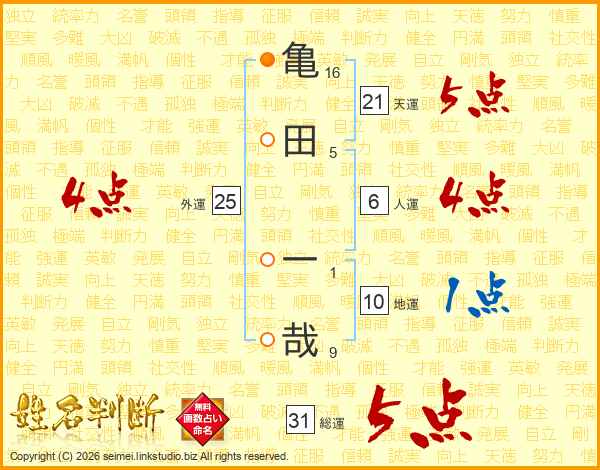 亀田一哉さんの天運は21画の5点!