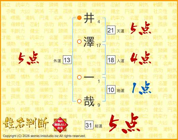 生活面を象徴する運勢です。外部から受ける影響力を表し、結婚運、家庭運や職場、環境への順応性を表します。総運から人運を引いた画数。姓や名が1文字の場合を除く。