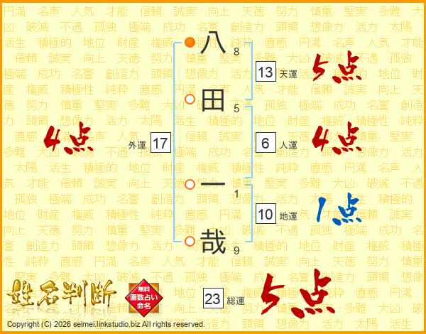 生活面を象徴する運勢です。外部から受ける影響力を表し、結婚運、家庭運や職場、環境への順応性を表します。総運から人運を引いた画数。姓や名が1文字の場合を除く。